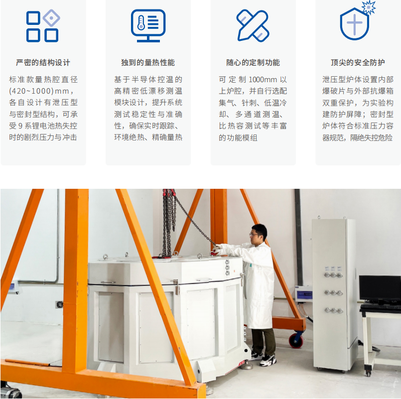 為適應(yīng)鋰電池單體向大體積與高比能量發(fā)展的趨勢,仰儀科技推出全球首創(chuàng)的BAC系列全尺寸電池ARC,系列定制型號量熱腔直徑可達1000mm以上。大型電池絕熱量熱儀可用于大容量和大尺寸電池單體熱穩(wěn)定性測試、熱失控電池產(chǎn)氣測試、材料熱安全性測試、充放電產(chǎn)熱測試、熱物性參數(shù)等關(guān)鍵數(shù)據(jù)的測量,為鋰電池?zé)岚踩蜔峁芾硖峁┛茖W(xué)的參考依據(jù)。