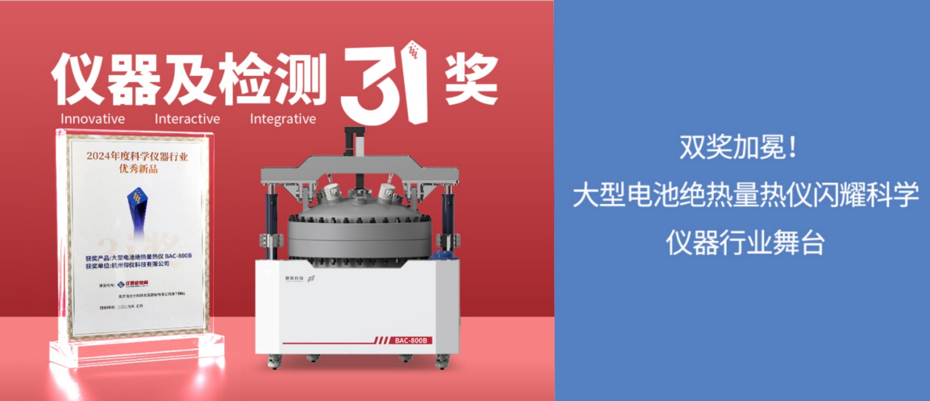 本次盛會上,仰儀科技BAC-800B大型電池絕熱量熱儀榮獲“3i獎-2024年度科學(xué)儀器行業(yè)優(yōu)秀新品獎”?!?i 獎-科學(xué)儀器行業(yè)優(yōu)秀新品獎”由儀器信息網(wǎng)于2006年設(shè)立,旨在公正客觀地展示創(chuàng)新儀器產(chǎn)品,鼓勵廠商創(chuàng)新,以滿足市場多樣化需求。經(jīng)過近20年的發(fā)展,該獎項已成為國內(nèi)外科學(xué)儀器行業(yè)的權(quán)威獎項,其獲獎名單得到多個政府部門的高度采信。