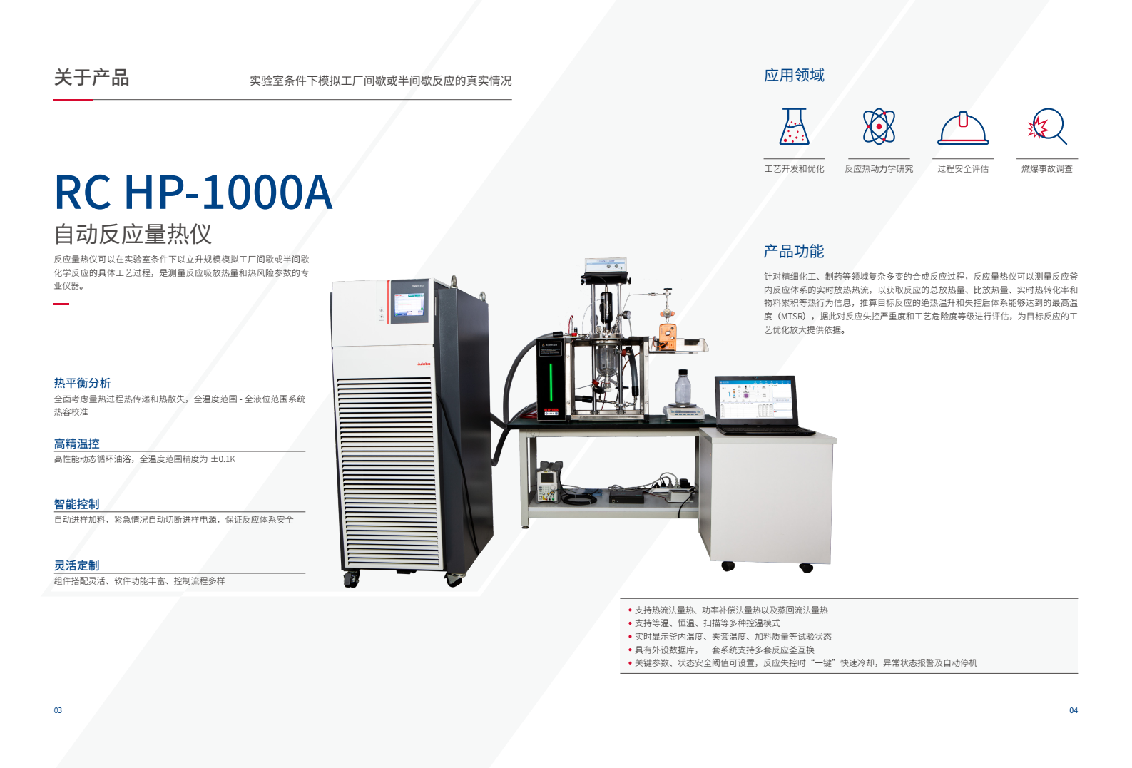 用戶可實時測量反應(yīng)釜內(nèi)樣品的反應(yīng)放熱熱流,以獲取反應(yīng)物的總放熱量、比放熱量、實時轉(zhuǎn)化率和物料累積等熱行為信息,自動標(biāo)定物料體系比熱容、傳熱系數(shù),推算目標(biāo)反應(yīng)的絕熱溫升和失控后體系能夠達(dá)到的最高溫度,據(jù)此對反應(yīng)工藝危險度進(jìn)行評估,為目標(biāo)反應(yīng)的工藝優(yōu)化放大提供依據(jù)。