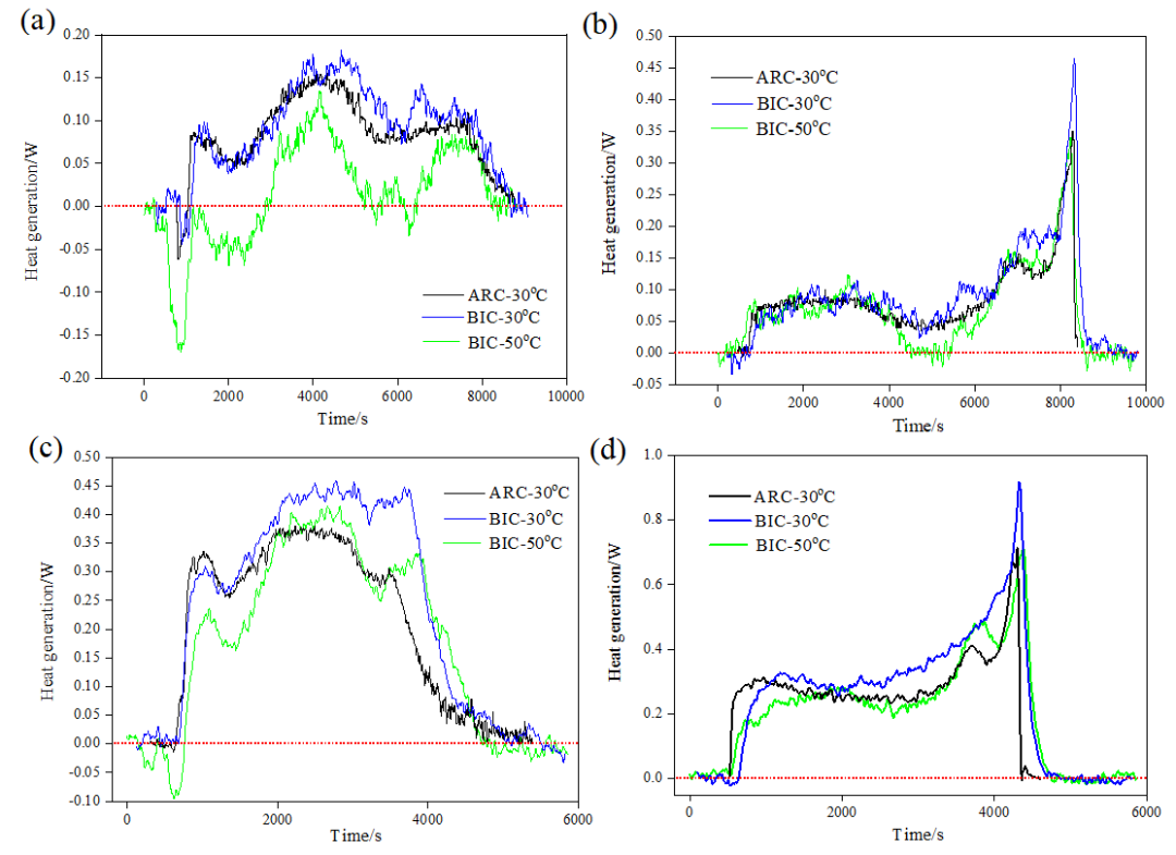 圖3 18650電池在(a,b)0.5C和(c,d)1C倍率下電池(a,c)充電和(b,d)放電產(chǎn)熱功率測(cè)量結(jié)果對(duì)比