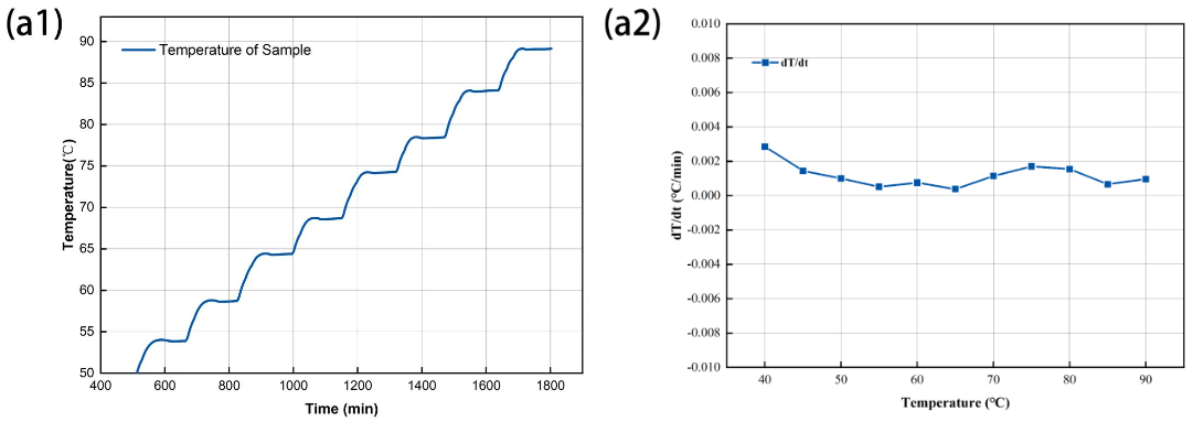 由于量熱腔內(nèi)可能存在微小的溫度分布,為防止絕熱追蹤階段量熱腔壁面對樣品產(chǎn)生過加熱或欠加熱,確保腔內(nèi)精密的絕熱環(huán)境,需利用與電池同尺寸的鋁質(zhì)標(biāo)準(zhǔn)塊作為電池等容物,利用儀器的“溫差基線”模式對爐壁-樣品溫差的溫度依賴性進行校準(zhǔn);該步驟的實驗要點如下:
