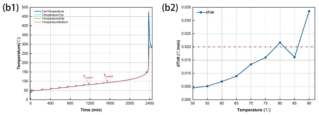 3) 只存在一個Tonset溫度。圖7b出現(xiàn)2個Tonset,上述現(xiàn)象有一定概率會發(fā)生,可能與SEI膜分解和再生的動態(tài)平衡有關(guān),但更可能是校準(zhǔn)文件不理想帶來的結(jié)果;圖7c使用圖4c的校準(zhǔn)文件進行測試,相鄰臺階的溫升速率無規(guī)波動,可能出現(xiàn)多次檢出Tonset的反常結(jié)果。