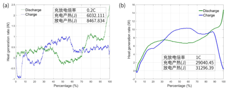 最后,利用50Ah軟包電池研究了倍率的影響。如圖3a所示,在0.2C倍率下,充放電曲線都存在吸熱區間,且兩條曲線具有明顯的對稱性,說明此時電池產熱以電極反應熱為主,可逆熱占比很高;而在1C倍率下,充放電產熱充放電曲線對稱性減弱,且未出現明顯的吸熱峰。這是由于在提高充放電倍率情況下,可逆反應熱基本保持不變,但極化熱和焦耳熱等不可逆熱顯著提高。