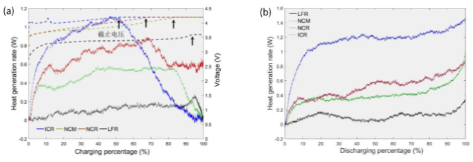如圖1a所示[3],充電過程LFR電池的產熱功率最低,而ICR的產熱功率最大。同時充電至截止電壓后,產熱功率會隨充電電流迅速下降;而放電過程(圖1b)四種電池產熱功率單調上升,這是因為在放電過程中電池內阻逐漸增大。同時四種電池的產熱功率與產熱量大小順序與充電過程一致。上述結果符合四種電池的容量與正極材料熱穩定性特征。