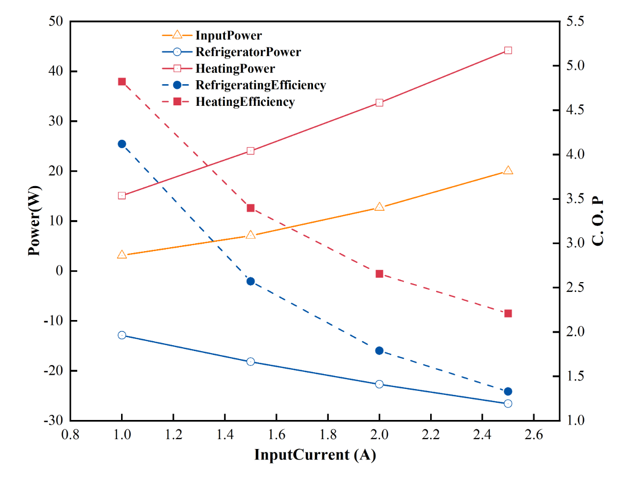 但在滿足制冷需求的基礎(chǔ)上,為提高能源利用率,TEC系統(tǒng)工作的電流不宜過大。另一方面,不同工作電流下TEC的制冷效率都比制熱效率低,主要受Joule熱效應的影響。