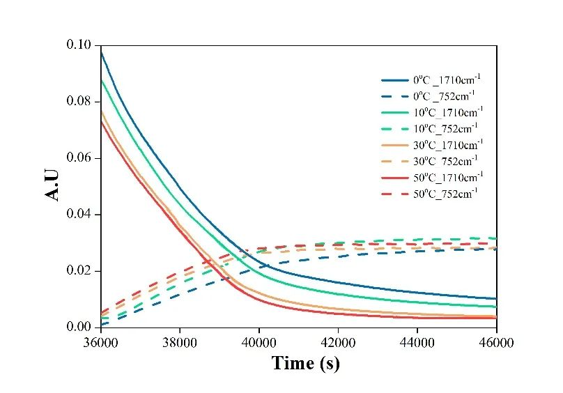 在0℃、10℃、30℃、50℃的等溫條件下進(jìn)行間歇式反應(yīng),反應(yīng)過程中原位采集體系紅外光譜,獲得1710 cm-1和 753cm-1吸收峰的強(qiáng)度隨時(shí)間變化數(shù)據(jù)。結(jié)果如下圖所示: