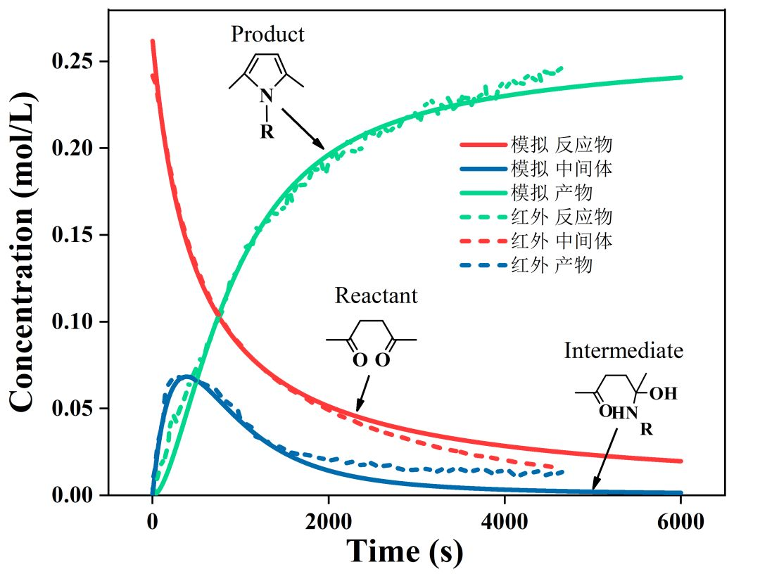 根據(jù)反應(yīng)動(dòng)力學(xué)模型和計(jì)算得到的動(dòng)力學(xué)參數(shù)可預(yù)測(cè)反應(yīng)物、中間體和產(chǎn)物的濃度隨時(shí)間變化規(guī)律。如圖6所示,通過軟件模擬與紅外定量得到的變化趨勢(shì)基本吻合,說明該動(dòng)力學(xué)模型可以較好地描述反應(yīng)過程。