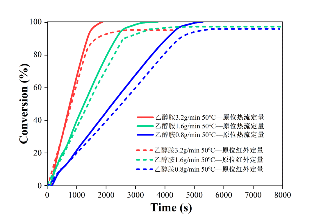 我們將通過紅外與在線量熱分別計(jì)算得到的轉(zhuǎn)化率曲線進(jìn)行對(duì)比,可以發(fā)現(xiàn)兩者非常接近。可以認(rèn)為前者代表了反應(yīng)物轉(zhuǎn)化率變化,后者代表了反應(yīng)完成度變化,均可以體現(xiàn)反應(yīng)的動(dòng)力學(xué)特征。理論上,化學(xué)反應(yīng)轉(zhuǎn)化率越高,兩者的差異越小。