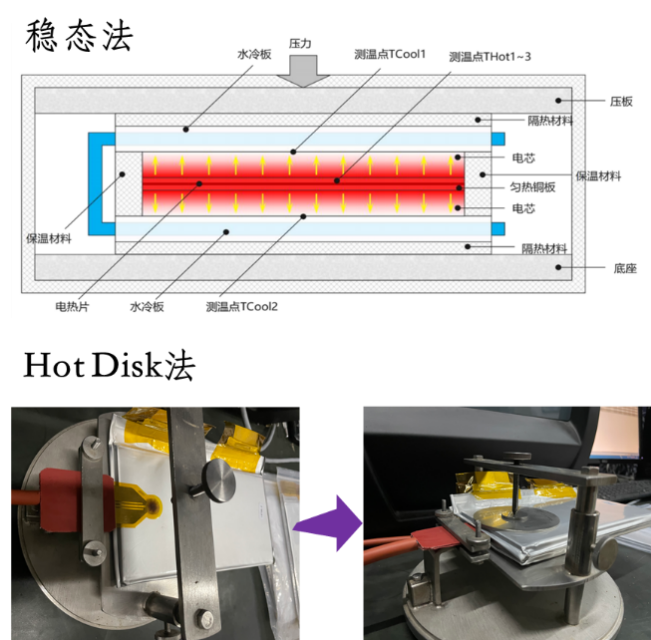 對(duì)于硬殼電池的導(dǎo)熱系數(shù),目前業(yè)內(nèi)大多使用經(jīng)驗(yàn)值或原理模型進(jìn)行估計(jì)。而軟包電池導(dǎo)熱系數(shù)的測(cè)試則存在一些可行的方法,可分為穩(wěn)態(tài)法和非穩(wěn)態(tài)法。穩(wěn)態(tài)法作為一種傳統(tǒng)方法,對(duì)樣品導(dǎo)熱系數(shù)的測(cè)定結(jié)果相對(duì)準(zhǔn)確。但是該方法對(duì)樣品尺寸要求較高、只能得到縱向?qū)嵯禂?shù)且測(cè)試時(shí)間較長(zhǎng)。而非穩(wěn)態(tài)法測(cè)試時(shí)間短,但是測(cè)試準(zhǔn)確性不如穩(wěn)態(tài)法。非穩(wěn)態(tài)法主要包括熱線(xiàn)法、閃光法和Hot Disk法,其中熱線(xiàn)法和閃光法不匹配鋰電池測(cè)試的應(yīng)用場(chǎng)景,而Hot Disk法則已在行業(yè)內(nèi)被廣泛使用(圖1)。