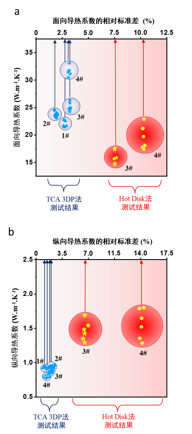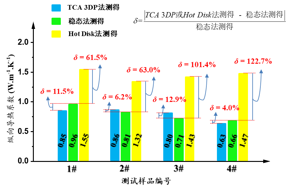 此外,為了驗(yàn)證TCA 3DP和Hot Disk兩種方法的準(zhǔn)確性,我們以穩(wěn)態(tài)法的測(cè)試結(jié)果作為參標(biāo),計(jì)算這兩種方法測(cè)定的縱向?qū)嵯禂?shù)與穩(wěn)態(tài)法的相對(duì)偏差,結(jié)果如圖4所示。可以看出,TCA 3DP法測(cè)得的結(jié)果與穩(wěn)態(tài)法更為接近,相對(duì)偏差在4% ~ 11.5%之間,而Hot Disk法測(cè)得的結(jié)果與穩(wěn)態(tài)法差別較大,相對(duì)偏差在61.5% ~ 122.7%之間。因此,我們可以得出結(jié)論相比于Hot Disk法,TCA 3DP法測(cè)得的導(dǎo)熱系數(shù)更為準(zhǔn)確。