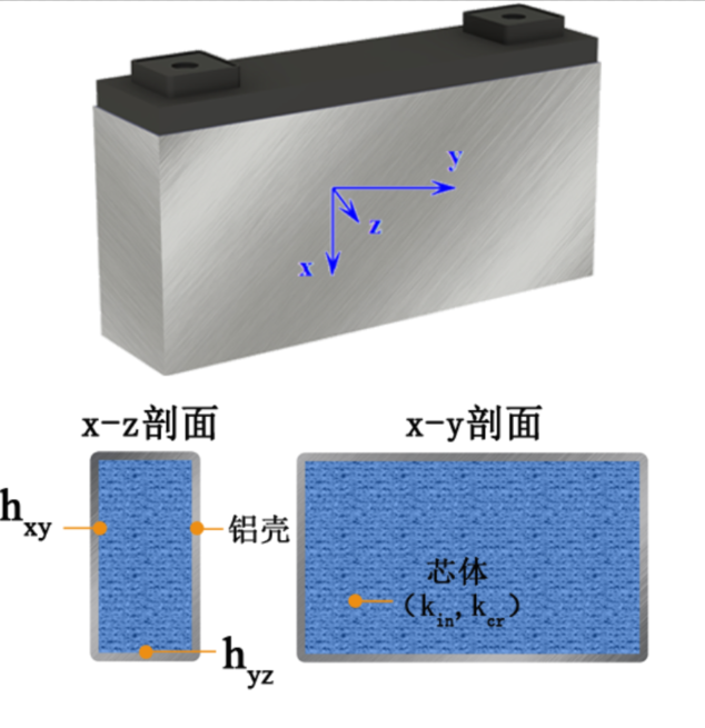 為了在不改變電池傳熱規(guī)律的前提下簡化計(jì)算,如圖2所示,可將方形電池簡化為金屬外殼和內(nèi)部芯片兩部分組成的非均質(zhì)等效模型。其中芯體熱特性為正交各向異性;殼體為均質(zhì),且已知其熱物性參數(shù)。