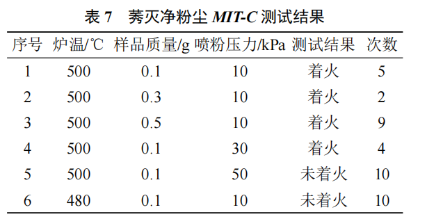 研究結(jié)果表明,莠滅凈粉塵屬非導(dǎo)電性粉塵,粉塵云最小點(diǎn)火能在有、無電感負(fù)載放電方式下分別為3~6、12~25mJ,粉塵云最低著火溫度480℃,粉塵云爆炸下限質(zhì)量濃度30~50g/m3,粉塵云極限氧體積分?jǐn)?shù)10%。莠滅凈粉塵到達(dá)熔點(diǎn)后熔化且熔化前未著火,其粉塵層最低著火溫度無意義。