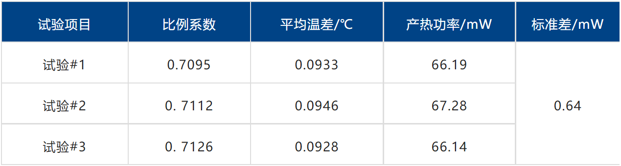 測量結(jié)果如圖3與表1所示,該讀數(shù)頭的產(chǎn)熱功率約為67mW,3次測試重復性優(yōu)于1%。另外,綠色陰影區(qū)域為量熱儀實測得到的產(chǎn)熱功率變化,藍色區(qū)域為推測的讀數(shù)頭真實產(chǎn)熱功率。由于樣品自身的熱容以及讀數(shù)頭至冷板的導熱路徑上存在熱阻,實測數(shù)據(jù)存在一定的熱滯后現(xiàn)象。根據(jù)被測系統(tǒng)的傳熱特性,可以利用一階校準公式對熱滯后進行修正。