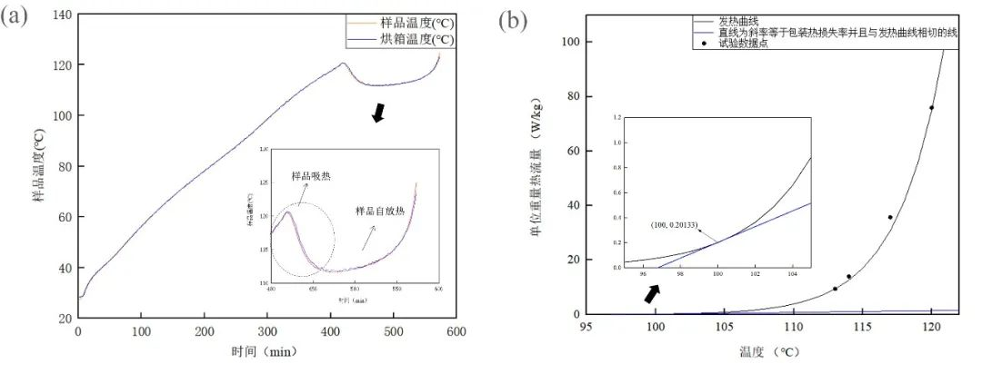 樣品升溫曲線如圖3(a)所示,當(dāng)樣品達(dá)到120℃的目標(biāo)溫度后,首先發(fā)生吸熱膨脹,膨脹結(jié)束后可以檢測到自放熱,此時(shí)儀器控制環(huán)境溫度對樣品溫度進(jìn)行追蹤。當(dāng)樣品自放熱速率到達(dá)閾值后,冷卻裝置自動開啟。如圖3(b),實(shí)驗(yàn)結(jié)束后選取絕熱溫升曲線上合適的溫度點(diǎn),計(jì)算該溫度下的單位質(zhì)量發(fā)熱率,并利用最小二乘法擬合得到發(fā)熱曲線。同時(shí),確定試樣在實(shí)際運(yùn)輸中包裝單位質(zhì)量熱損失率K為0.063W/(K·kg),在圖中繪制斜率為K并與發(fā)熱曲線相切的直線,直線在x軸上的截距對應(yīng)臨界環(huán)境溫度,即包裝中物質(zhì)不出現(xiàn)自加速分解的最高溫度。SADT按臨界環(huán)境溫度向上修至5(℃)整數(shù)倍,故此樣品SADT為100℃。