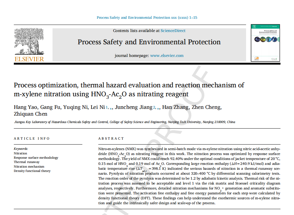 南京工業(yè)大學(xué)倪磊教授團(tuán)隊(duì)在 Process Safety and Environmental Protection 期刊發(fā)表題為 Process optimization, thermal hazard evaluation and reaction mechanism of m-xylene nitration using HNO3-Ac2O as nitrating reagent 論文,該成果由國(guó)家自然科學(xué)基金項(xiàng)目(No. 21927815, 52334006, 52274209)等支持。