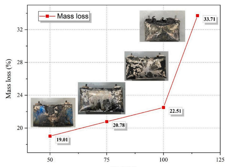 對熱失控后的電池殘骸進(jìn)行稱量,可計(jì)算質(zhì)量損失率。該方法同樣能夠判斷電池?zé)崾Э貏×页潭取膱D2可以發(fā)現(xiàn),SOC越高,電池的質(zhì)量損失率越大,這是由于高SOC的電池在熱失控過程中通常伴隨更強(qiáng)烈的電池材料噴發(fā)、起火和燃爆現(xiàn)象。