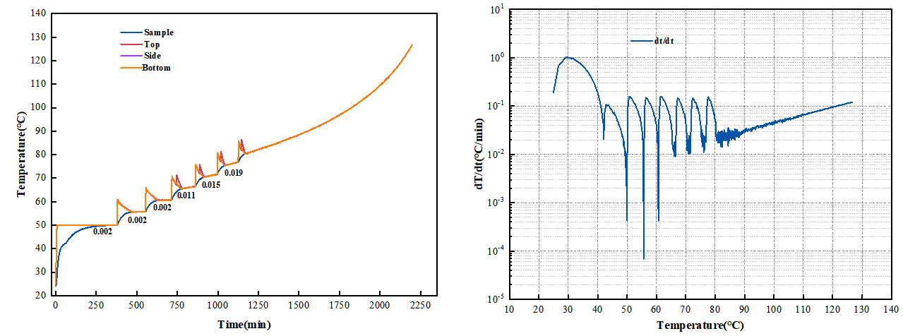 圖5使用金屬板夾具的標(biāo)準(zhǔn)電阻塊HWS溫升(左圖)及溫升速率-溫度(右圖)曲線