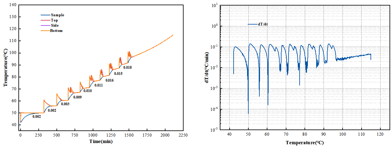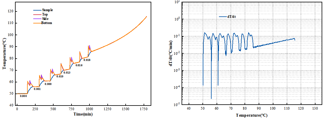 通過對比不同實驗條件下標(biāo)樣在各溫度臺階的溫升速率、Tonset檢出溫度以及進入追蹤階段不同溫度下的溫升速率,可以得出以下結(jié)論: