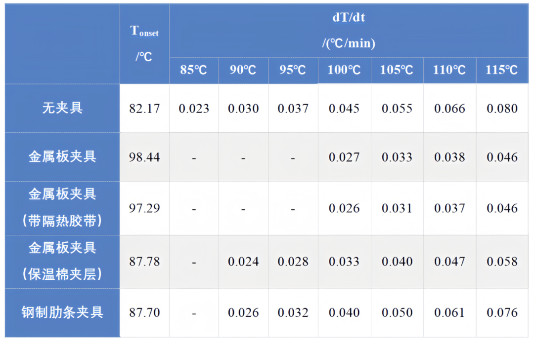 在上述實驗過程中,電池在高溫下內(nèi)部產(chǎn)氣易發(fā)生鼓脹,通常需要使用夾具固定溫度傳感器,防止由于傳感器虛接或脫落導(dǎo)致測溫異常,確保測定數(shù)據(jù)的準(zhǔn)確性。然而,夾具存在一定的熱惰性,實驗過程中可能會吸收電池釋放的部分熱量,導(dǎo)致電池溫升速率的檢測結(jié)果偏低,自放熱起始溫度Tonset等測定結(jié)果滯后。