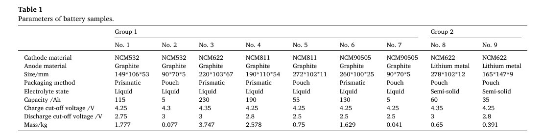 樣品準(zhǔn)備:實(shí)驗(yàn)樣品涵蓋不同鎳含量的 NCM 三元液態(tài)電解質(zhì)鋰離子電池和 NCM622 半固態(tài)鋰金屬電池。其中,NCM 液態(tài)電解質(zhì)電池依鎳含量差異可分為中鎳(NCM532 / 石墨、NCM622 / 石墨)、高鎳(NCM811 / 石墨)和超高鎳(NCM90505 / 石墨)電池。