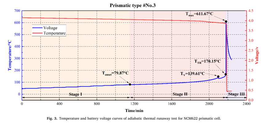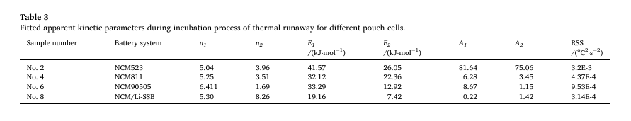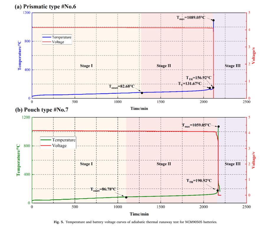 2.同一體系的方形和軟包鋰離子電池的熱失控過(guò)程存在差異。方形電池的TTR隨著鎳含量的增加而降低,從NCM532的186.49°C逐漸降低至NCM90505的156.92°C,而軟包電池的TTR保持在190°C左右。此外,軟包電池在達(dá)到TTR后會(huì)有一個(gè)誘導(dǎo)期才會(huì)快速升溫。