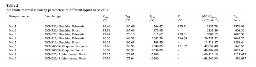 1.不同NCM液態(tài)鋰離子電池的Tonset一般在80-90°C范圍內(nèi),表明鋰離子液態(tài)電池的SEI膜分解機(jī)制與正極材料相關(guān)性較小。隨著系統(tǒng)中鎳含量占比的增加,熱失控孕育時(shí)間和持續(xù)時(shí)間縮短,而熱失控過(guò)程中釋放的單位Ah能量、能量釋放速率和質(zhì)量損失率均增加,說(shuō)明熱失控的劇烈程度隨著電池能量密度的增加而增加
