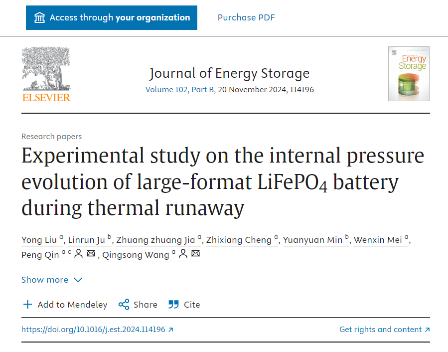 中國科學(xué)技術(shù)大學(xué)王青松教授團(tuán)隊(duì)在《Journal of Energy Storage》(IF:8.9)期刊發(fā)表題為《Experimental study on the internal pressure evolution of large-format LiFePO4 battery during thermal runaway》論文。該研究由中國科學(xué)技術(shù)大學(xué)火災(zāi)科學(xué)國家重點(diǎn)實(shí)驗(yàn)室、合肥國軒高科動力能源有限公司和合肥工業(yè)大學(xué)電氣與自動化工程學(xué)院等機(jī)構(gòu)聯(lián)合支持,重點(diǎn)探討了大容量磷酸鐵鋰電池在熱失控過程中的內(nèi)部壓力演變機(jī)制。