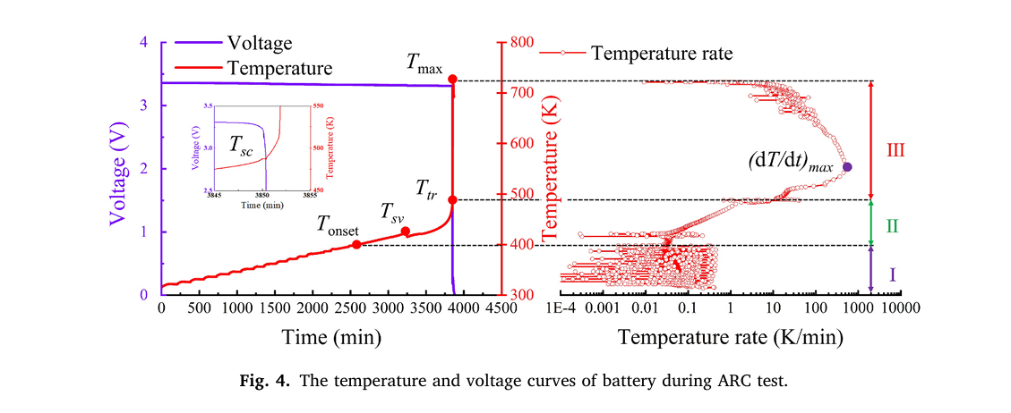 利用BAC-420A的HWS模式開展熱失控測試,模擬絕熱環(huán)境并記錄溫度、電壓等數(shù)據(jù)。確定了自放熱起始溫度(Tonset)、熱失控起始溫度(TTR)和熱失控最高溫度(Tmax)等關(guān)鍵溫度點(diǎn),實(shí)驗(yàn)將熱失控過程分為三個階段,明確了各階段的反應(yīng)和溫度變化特點(diǎn)。