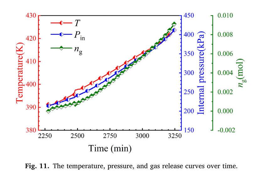 本研究中,團(tuán)隊(duì)使用仰儀科技大型電池絕熱量熱儀BAC-420A,并聯(lián)用壓力傳感器、氣相色譜儀等設(shè)備,針對充滿電的300Ah磷酸鐵鋰電池,對其在熱失控過程中的內(nèi)部壓力變化、氣體釋放情況以及溫度變化展開了詳細(xì)研究。