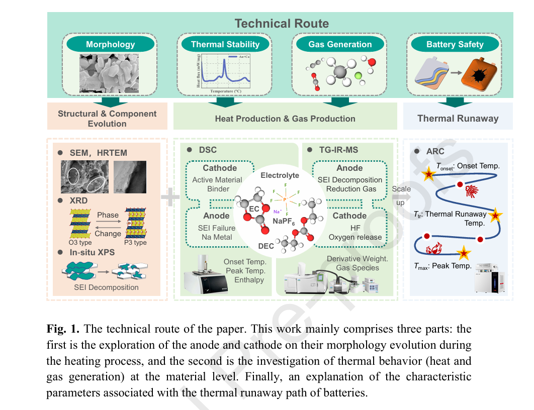 為實(shí)現(xiàn)對(duì)NFM/HC材料組合多層次的熱安全理解,研究采用了特定的技術(shù)路線(xiàn)對(duì)鈉離子電池從材料到電池層級(jí)的熱穩(wěn)定性進(jìn)行深度剖析。具體包括: