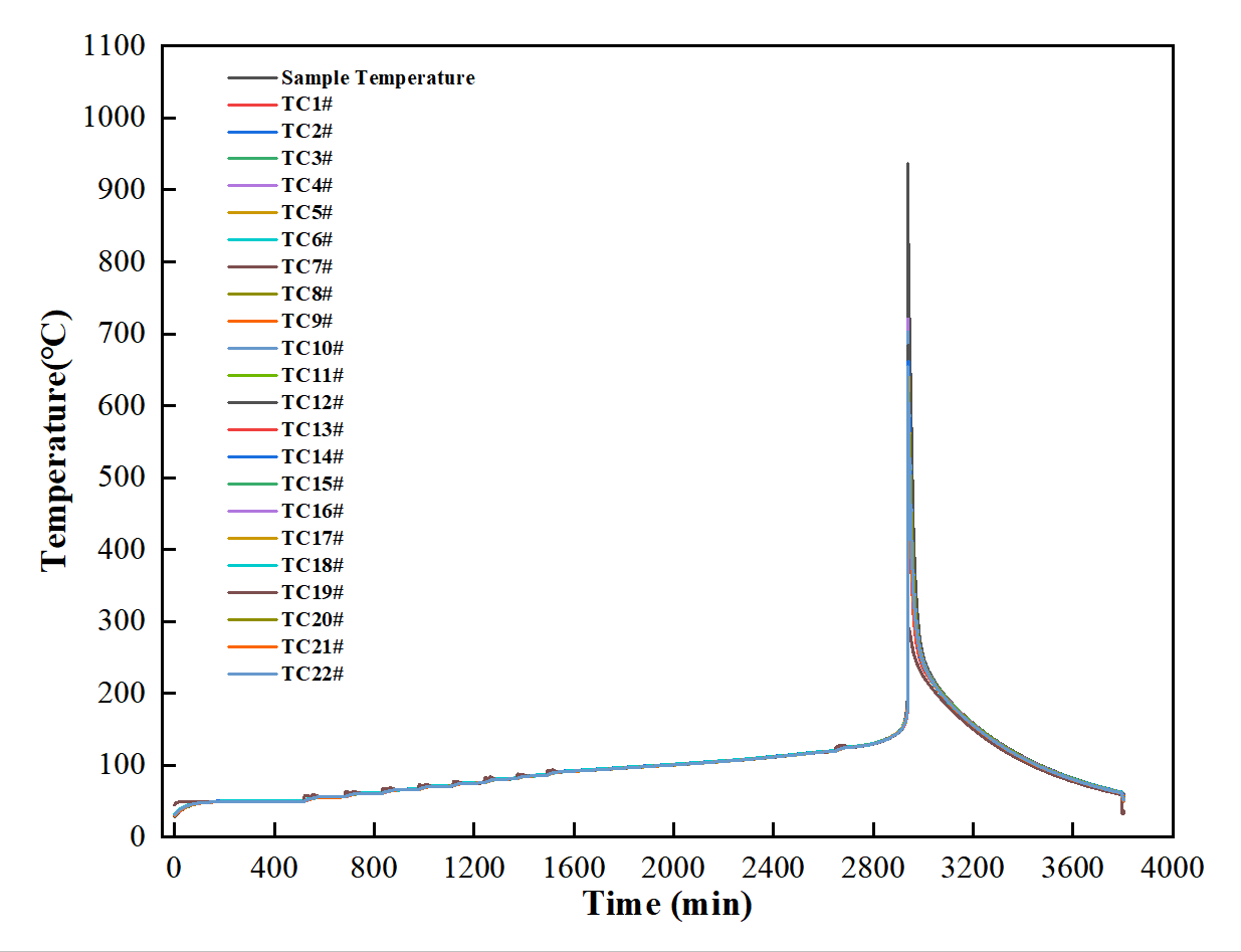 浙儀應(yīng)用研究院采用密閉型大型電池絕熱量熱儀BAC-800B,借助多通道測(cè)溫法蘭和數(shù)據(jù)采集儀進(jìn)行多點(diǎn)溫度測(cè)試,精準(zhǔn)獲取到電池?zé)崾Э剡^(guò)程完整的溫度變化曲線,清晰地呈現(xiàn)出電池自放熱后各個(gè)點(diǎn)的溫度變化情況,并準(zhǔn)確確定了電池?zé)崾Э攸c(diǎn)位及真實(shí)最高溫度等關(guān)鍵參數(shù)。