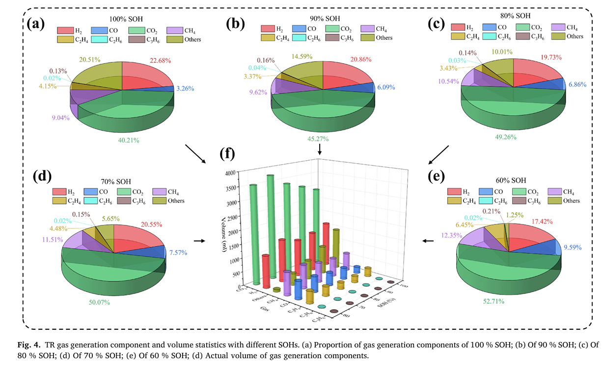 本研究通過定性與定量分析,系統(tǒng)闡述了低溫老化條件下不同SOH鋰離子電池的熱失控產(chǎn)氣特性與噴射火行為特征。實驗獲取了包括最高溫度、觸發(fā)時間、產(chǎn)氣成分、產(chǎn)氣量、爆炸風(fēng)險指數(shù)及噴射火擴散面積等關(guān)鍵參數(shù),全面剖析了不同SOH鋰離子電池的安全性能表現(xiàn)。上述研究成果將為提升電池在儲能場景及梯次利用過程中的安全性提供重要理論依據(jù)與技術(shù)支撐。