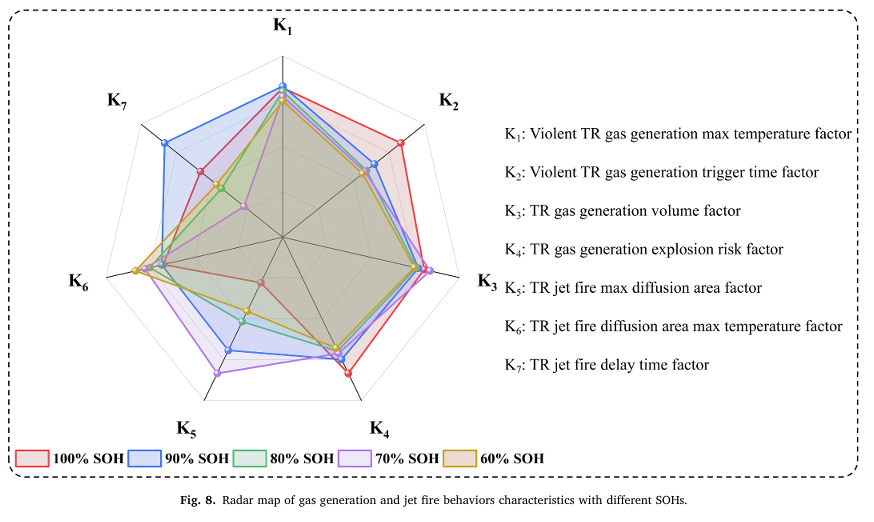 本研究還通過開展不同SOH電池的熱失控噴射火行為實驗,結(jié)合熱失控產(chǎn)氣參數(shù)進行應(yīng)用場景下的綜合特性分析,為儲能系統(tǒng)及電動汽車的電池管理系統(tǒng)(BMS)安全設(shè)計提供了關(guān)鍵技術(shù)指導(dǎo)。