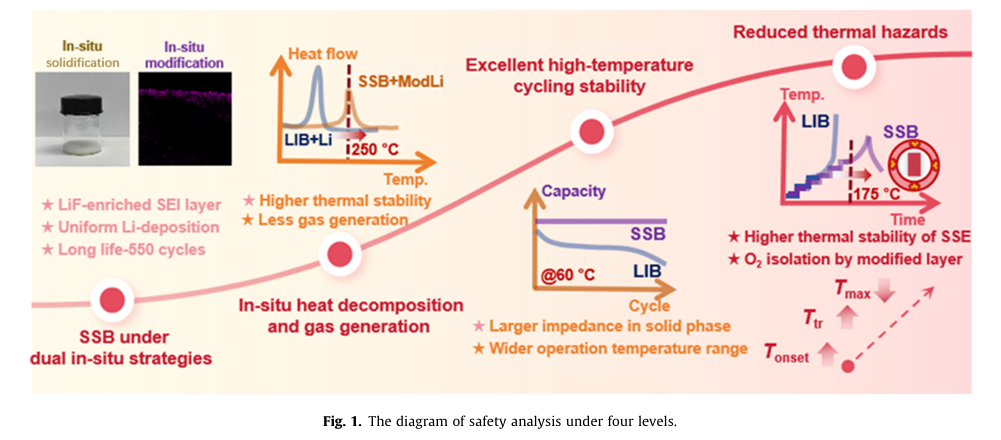 固態(tài)鋰金屬電池(SSB)被認為是最有前景的新型高比能鋰離子電池之一。針對鋰金屬電池中界面相容性差導致的電化學性能衰減、鋰枝晶生長引發(fā)的安全風險等關鍵問題,王青松教授團隊提出了“雙原位制備策略”(原位聚合固態(tài)電解質+鋰金屬負極原位改性),通過原位產(chǎn)熱/產(chǎn)氣分析、原位循環(huán)產(chǎn)熱測試等手段,證實該策略可顯著提升固態(tài)鋰金屬電池(SSB)的循環(huán)穩(wěn)定性與熱安全性。