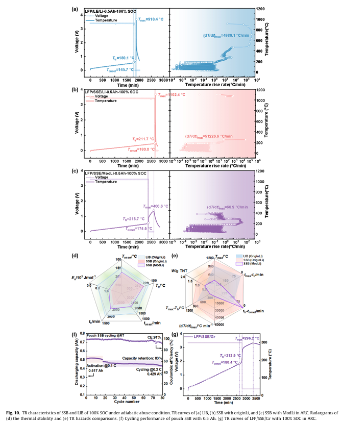 結果表明,在絕熱加熱熱失控實驗中,固態(tài)鋰金屬電池(SSB)的自發(fā)熱起始溫度相比液態(tài)電池(LIB)滯后超過30℃,熱失控出發(fā)溫度也隨之提升。并且最高溫度以及最高溫升速率的降低也證實了固態(tài)鋰金屬電池(SSB)較低的熱失控危害性。