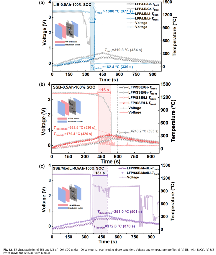 在外部加熱實驗中,固態(tài)電池從起始熱失控溫度到熱失控最高溫的時間間隔為131s,與液態(tài)電池的38s相比具有大幅度的延遲,為消防滅火措施的開展爭取了時間。